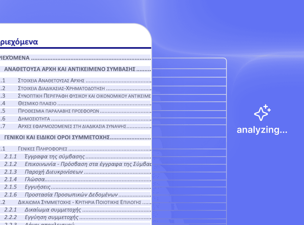 Το σύστημα διαβάζει τις ομάδες έργου και τα προηγούμενα έργα, ώστε να εντοπίζει ποιοι διαγωνισμοί έχουν πραγματικό ενδιαφέρον — και ποιοι φαίνονται “κλειστοί” ή για “λίγους”.
